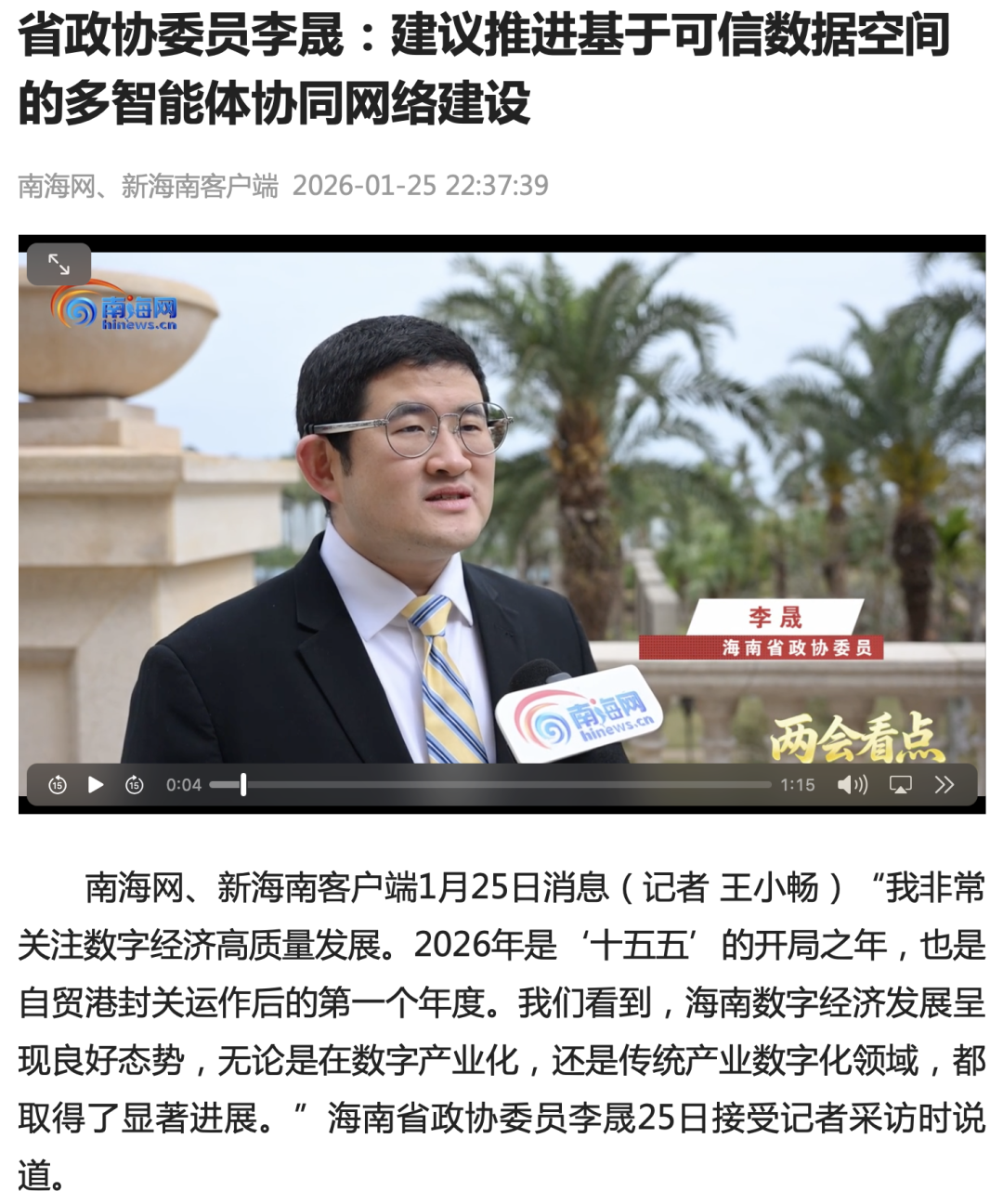 在采访中,李晟建议,海南持续推动数字经济赋能实体经济,特别是加快传统制造业的智改数转,运用人工智能、大数据等先进技术助力传统优势产业,如海洋产业、南繁种业、航空航天等,实现数字化与智能化转型升级。
