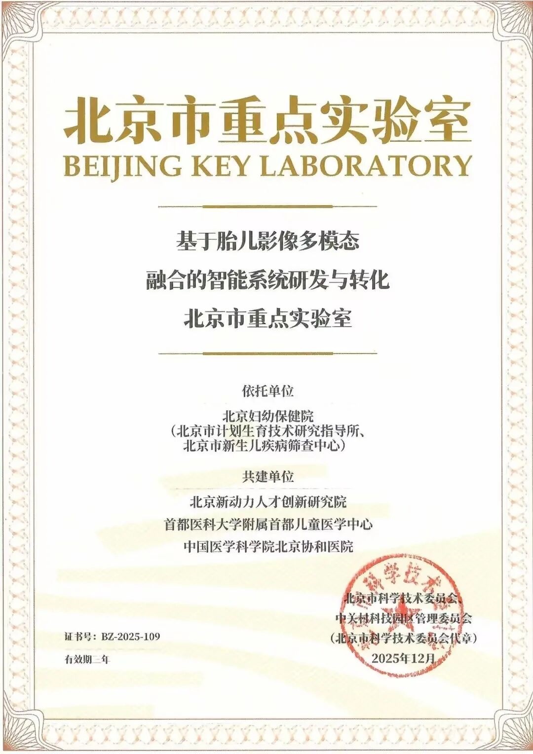 近日,北京市科学技术委员会、中关村科技园区管理委员会公布2025年北京市重点实验室拟认定名单,北京新动力研究院作为联合共建单位,获批1项北京市重点实验室。本次获批的北京市重点实验室为“基于胎儿影像多模态融合的智能系统研发与转化北京市重点实验室”,实现研究院北京市重点实验室“零的突破”!