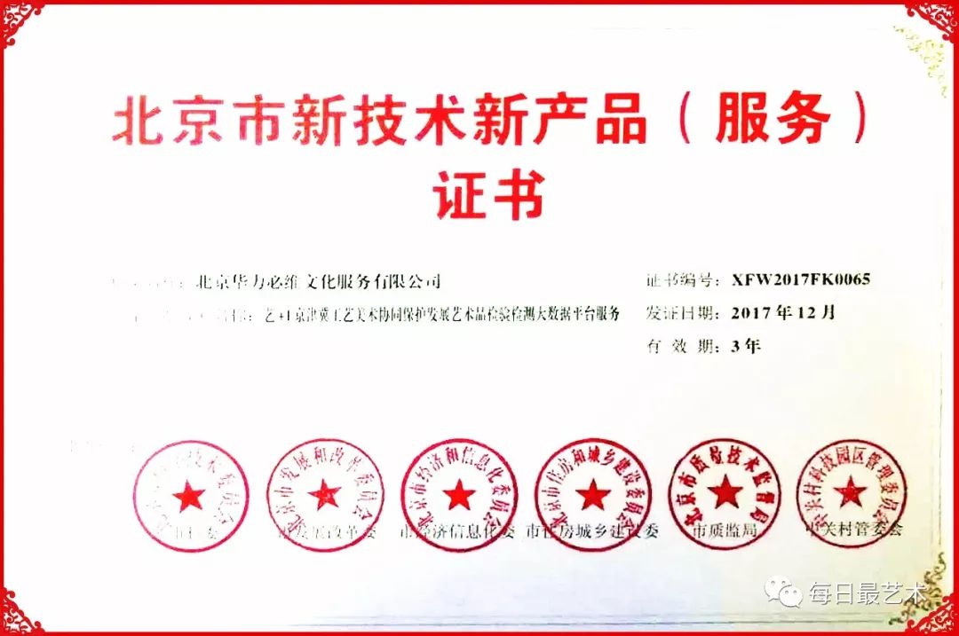 近日,国家级高新技术企业——华力必维所打造的艺+1京津冀工艺美术协同保护发展艺术品检验检测大数据平台服务,作为艺术品鉴证行业唯一入选项目,获颁 2017年 “北京市新技术新产品(服务)”证书。